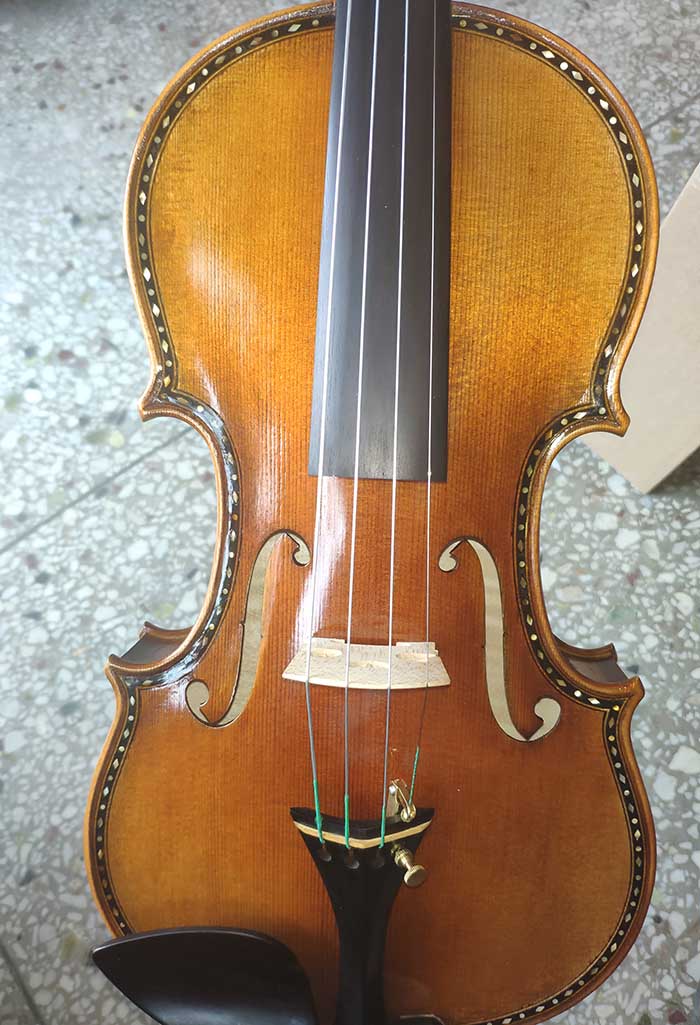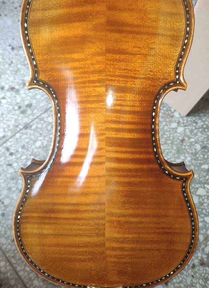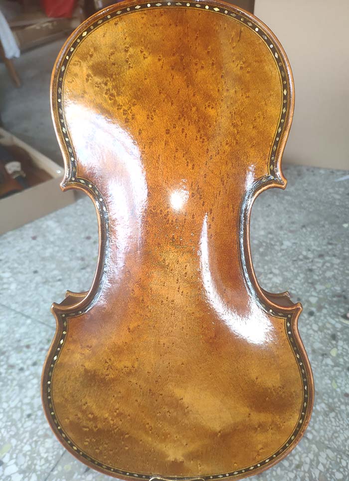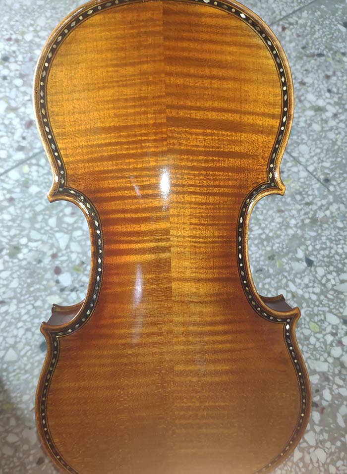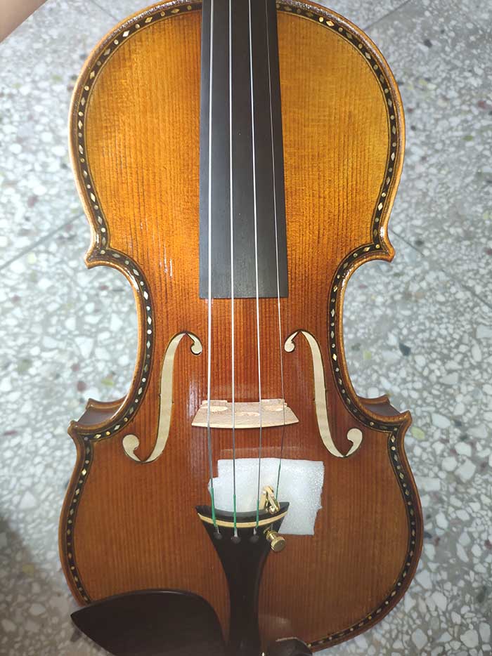 描述:一款非常精致的歐料小提琴,側(cè)板和琴頭有雕花,琴的邊緣有貝殼的鑲嵌。面板的木紋寬度在2-3毫米,背板為均勻的歐洲楓木。琴的邊緣部分油漆顏色較淺,中間部分的油漆偏深。這把琴音質(zhì)非常棒,非常甜美輕盈的感覺,專業(yè)演奏者的標(biāo)配。