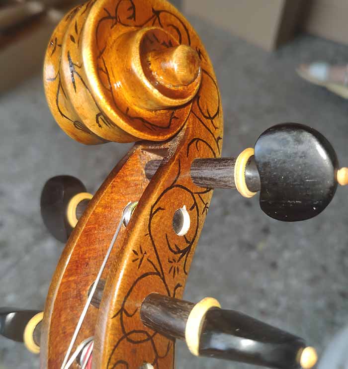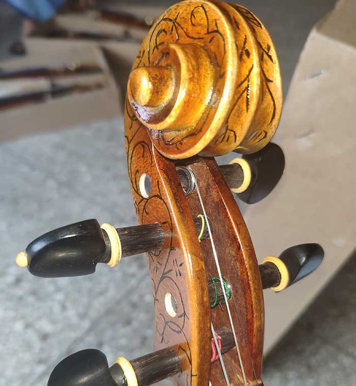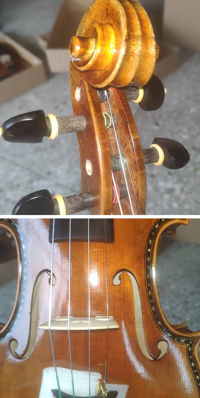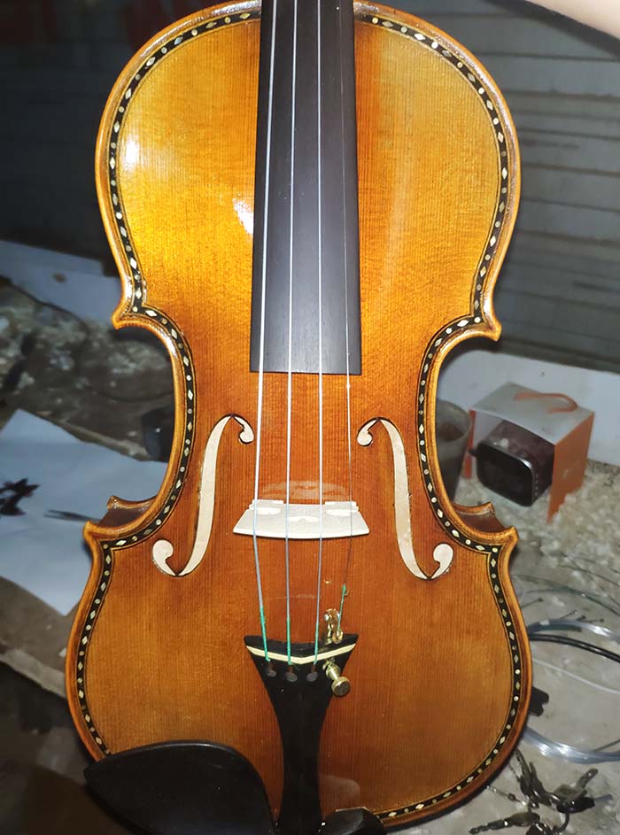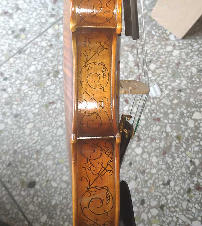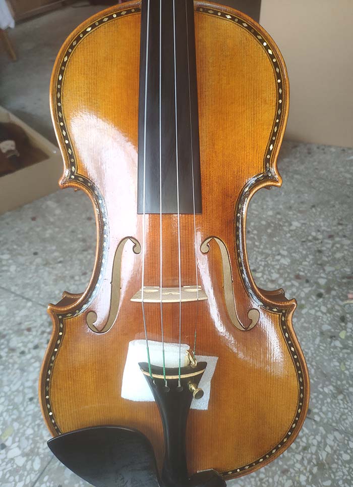 描述:一款非常精致的歐料小提琴,側(cè)板和琴頭有雕花,琴的邊緣有貝殼的鑲嵌。面板的木紋寬度在2-3毫米,背板為均勻的歐洲楓木。琴的邊緣部分油漆顏色較淺,中間部分的油漆偏深。這把琴音質(zhì)非常棒,非常甜美輕盈的感覺,專業(yè)演奏者的標(biāo)配。